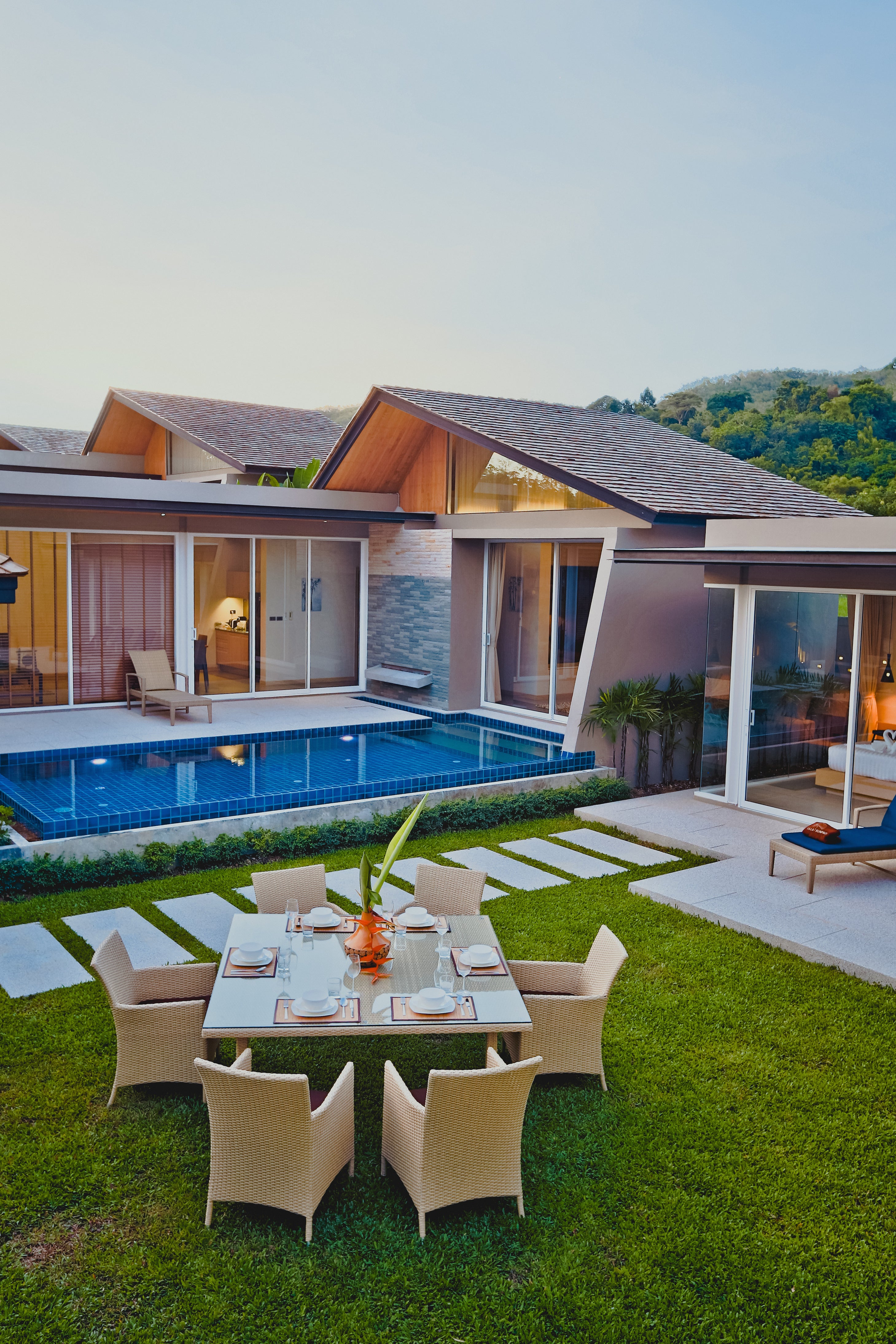 Tucked away in the serene hills near Layan Beach, the 3-bedroom Villa Sunpao offers a refined tropical living experience in one of Phuket’s most desirable locations. This modern villa features clean architectural lines, natural textures, and a seamless connection between indoor and outdoor spaces. The spacious open-plan living area is complemented by a fully equipped Western kitchen and expansive glass doors that open onto a lush garden and private swimming pool.