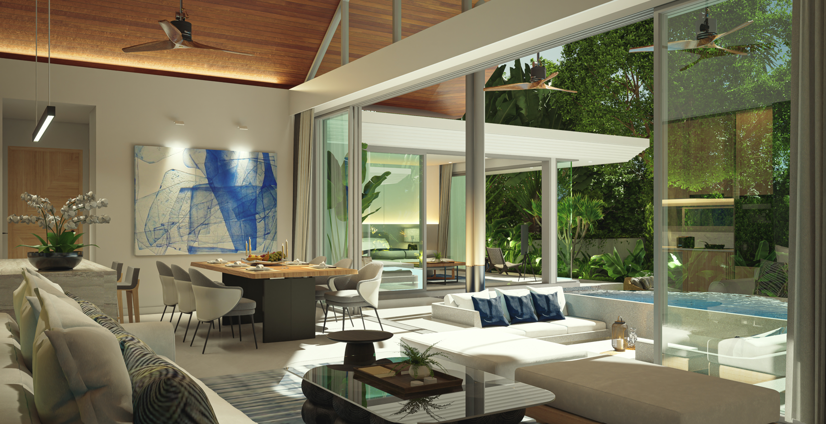 Residents enjoy high ceilings, sunken pool terraces, and seamless indoor-outdoor living in a serene tropical setting.