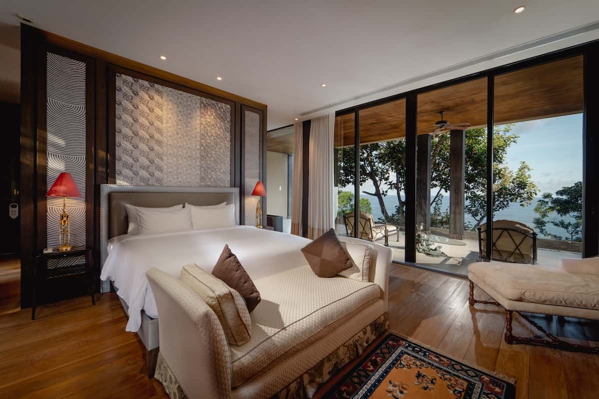 Guest Bedroom 1 – Sapphire: A king-sized bed with an upholstered headboard anchors this bright room on the second floor, with sliding glass doors that lead to a sheltered garden-view balcony.