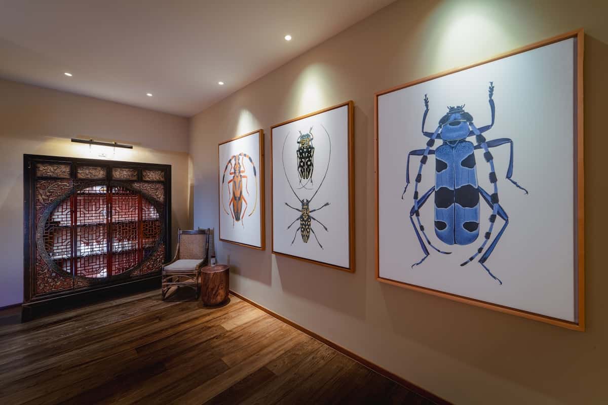 Guest Bedroom 2 – Lapis: Reminiscent of Japanese tatami-style rooms, this space features three single beds on a raised platform, surrounded by watercolor paintings. Ideal for children, it opens onto a small balcony with garden views.