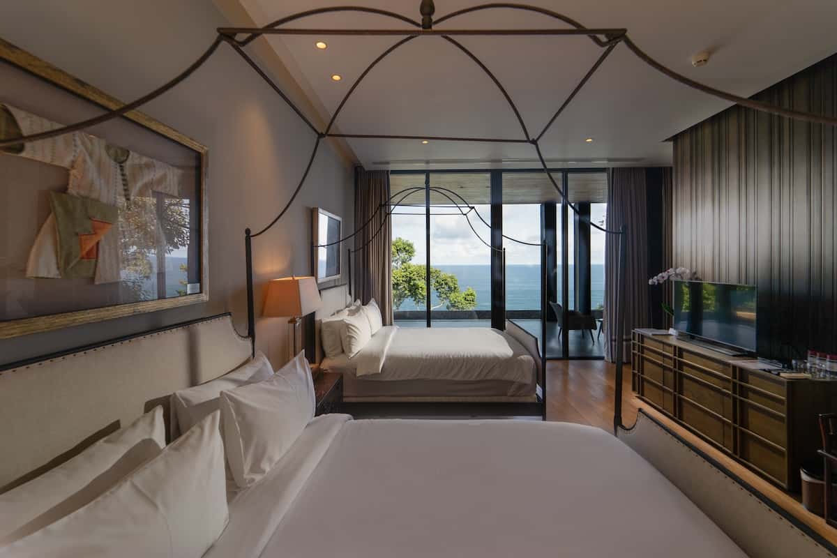 Guest Bedroom 3 – Amethyst: Adjacent to the Coral master suite, this elegant room includes two wrought-iron four-poster queen beds, a walk-in dressing area, and a large terrace with expansive sea views.