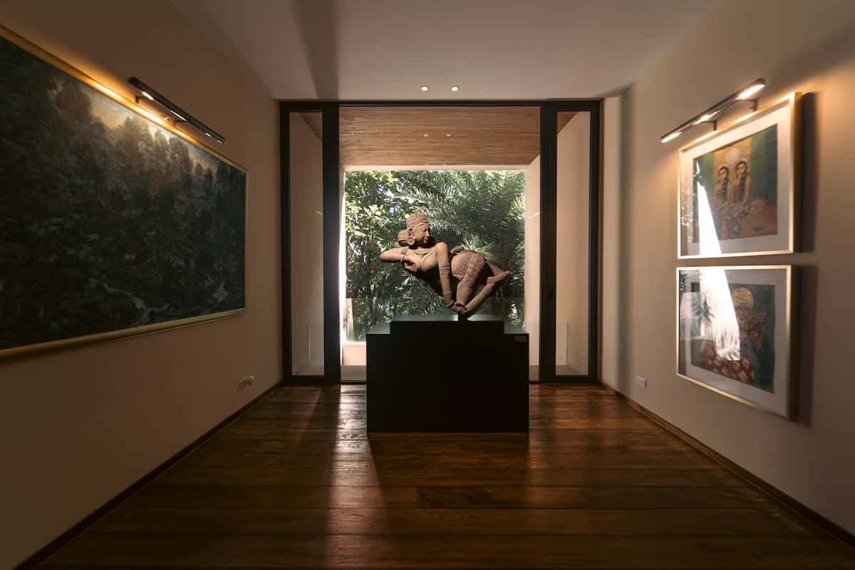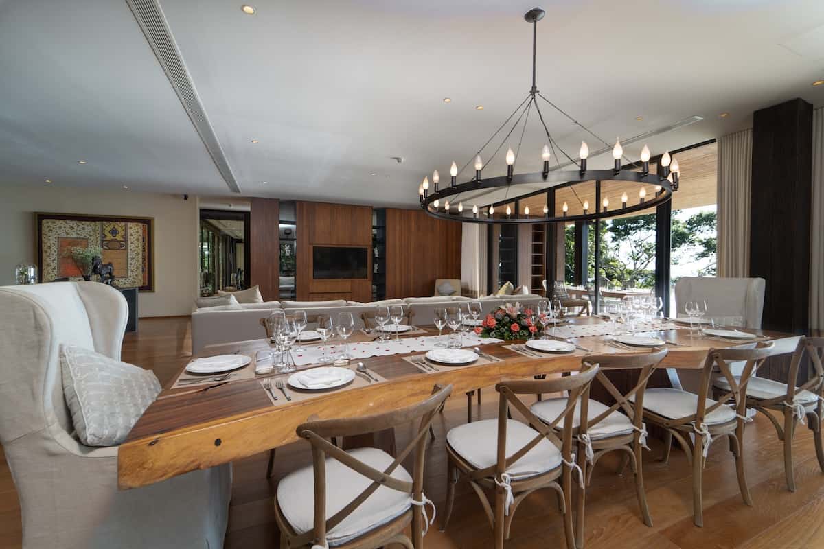 The villa’s lobby offers panoramic sea views through towering glass windows, flanked by ancient Indian wood-carved pillars. A lift and stairs connect to the lower levels, where wide sandstone-wall corridors lead to the living spaces. The open-plan living and dining area is the heart of the villa—a perfect blend of casual comfort and luxury. With an oversized L-shaped sofa, a solid wood dining table for 15, a chic chandelier, and additional seating arrangements, this space is designed for social gatherings. The full-service kitchen and breakfast bar add to the convenience, making it an ideal spot for that first cup of coffee.
