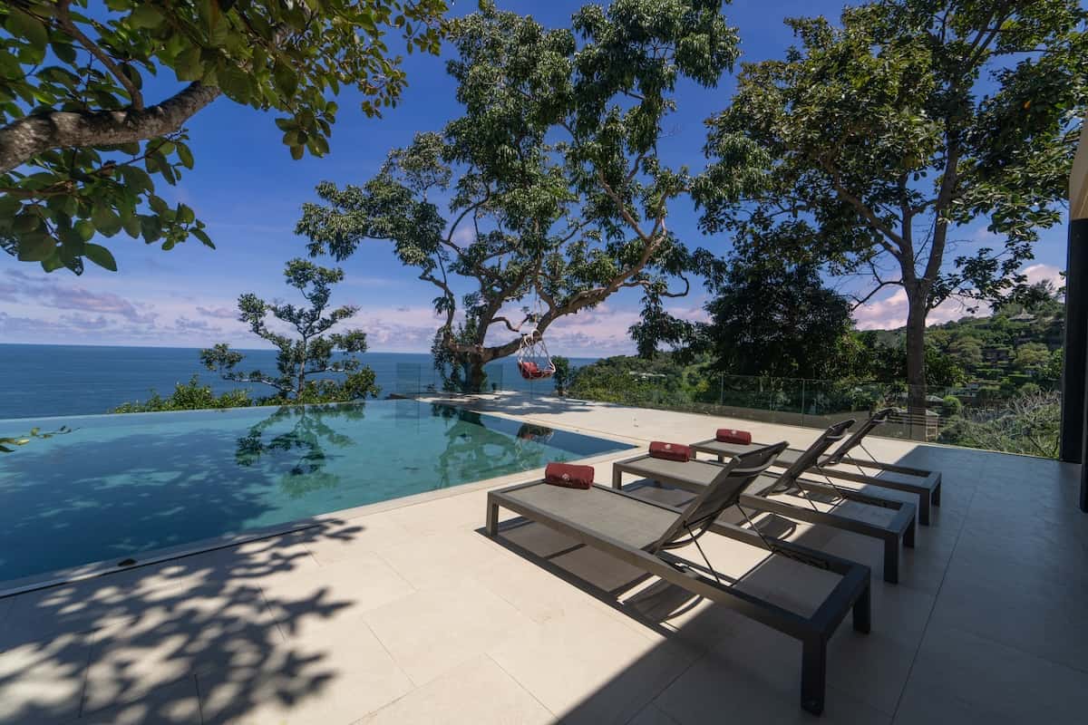 Stretching across the front of Villa is a magnificent 24-meter blue stone infinity pool, complete with a built-in jacuzzi. The wide stone terrace overlooks the ocean, partially shaded by trees, and features sunbeds for sunbathing and soft loungers for a more relaxed experience. This serene setting is perfect for enjoying breakfast while watching birds and dragonflies glide over the water. Stone steps lead down to tropical landscaped gardens, where you can explore the lush frangipani trees and exotic palms during an evening stroll.