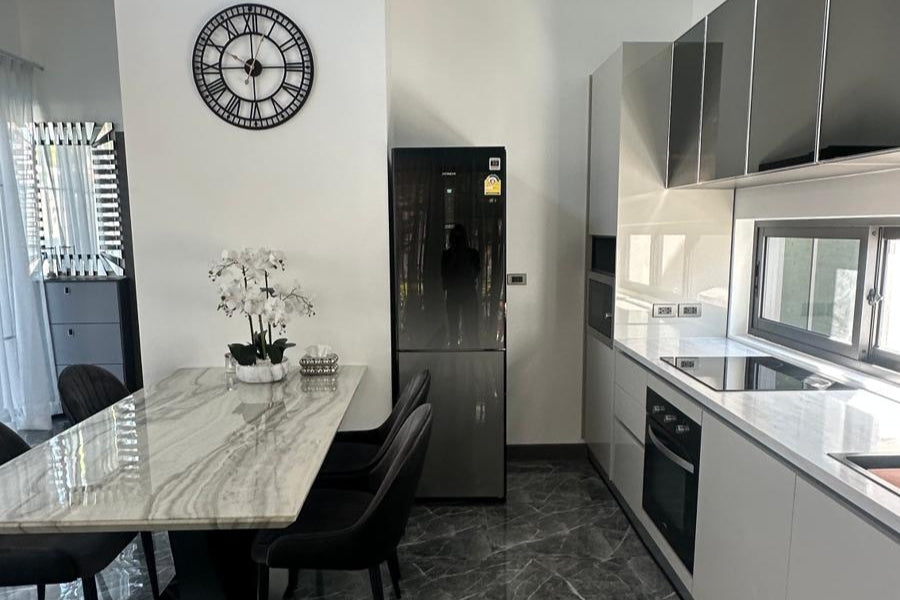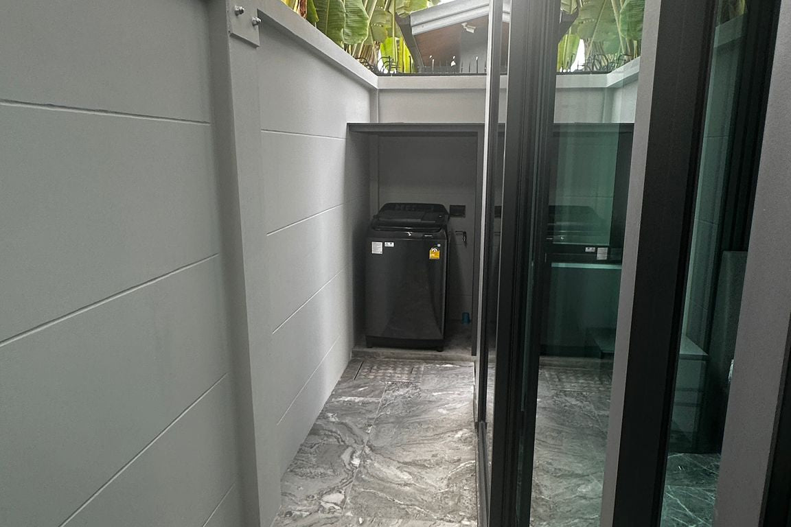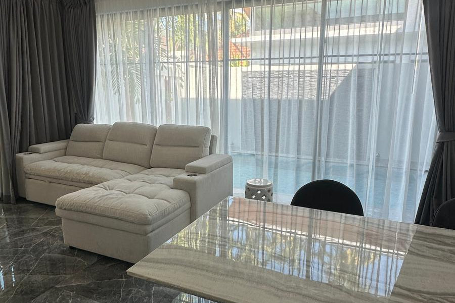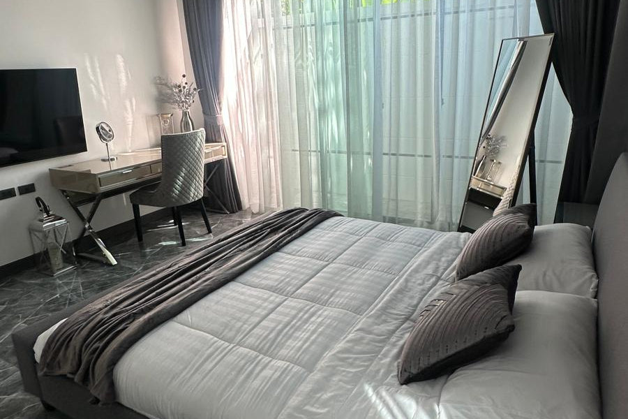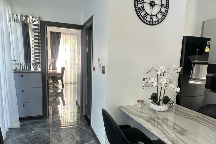 This modern villa in Rawai, Soi Tokdum, just 7 minutes from Nai Harn Beach, sits on a 200 sqm plot with 129 sqm of living space. Ready to move in, it includes built-in furniture and comes fully furnished with elegant modern fittings, a Western-style kitchen, two bedrooms, two bathrooms, and a spacious living room.