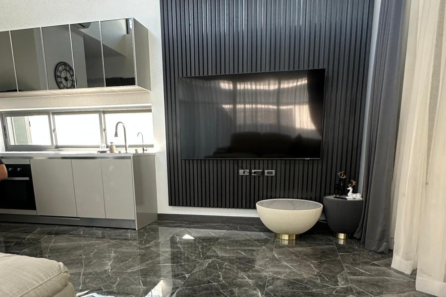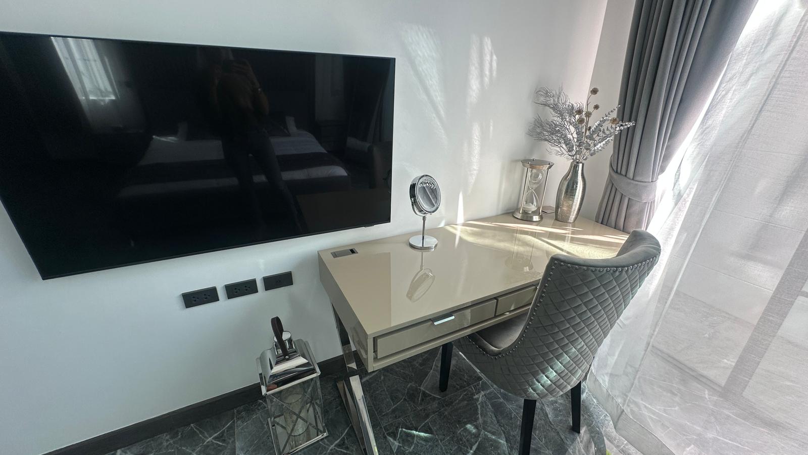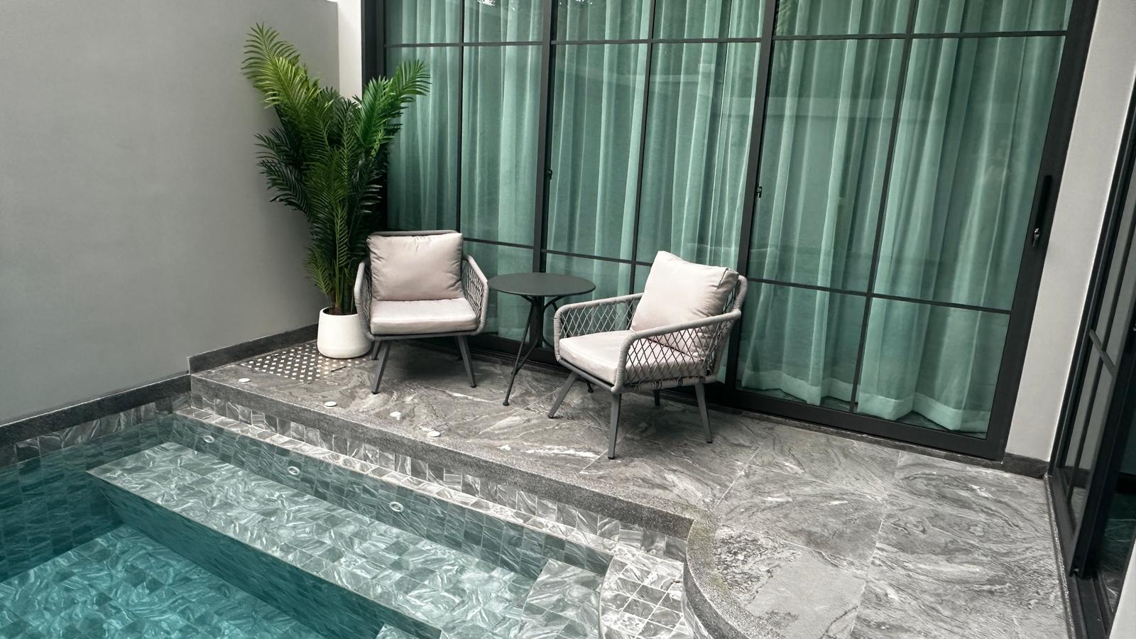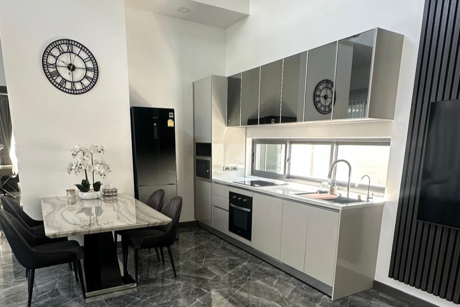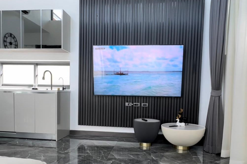 The property features a home theater system with cable TV and Wi-Fi, CCTV, and private parking. Designed with 4.5-meter-high ceilings, all rooms are bright and well-ventilated, with warm wooden finishes that add a natural charm. Outside, there's an 8-meter marble swimming pool with jacuzzi jets and a waterfall, plus a BBQ area. Additional highlights include a 75-inch TV, dishwasher, water filter, smart door lock, and freehold ownership with no common fees.