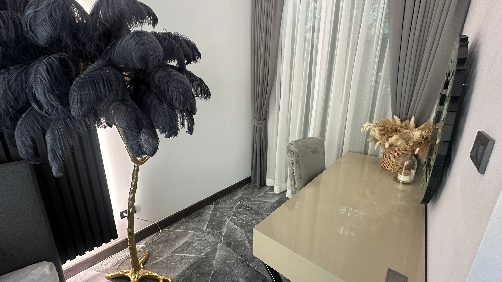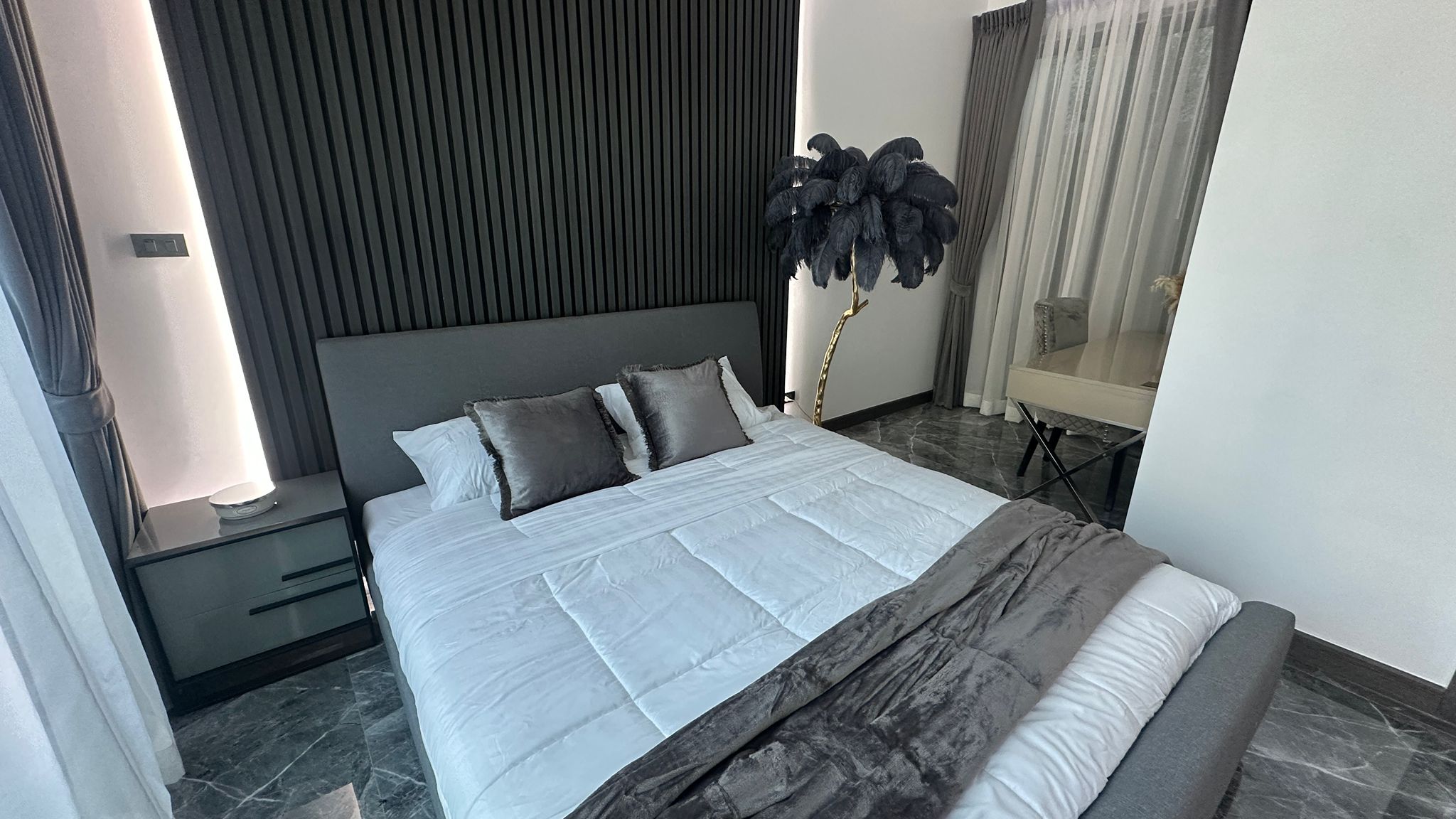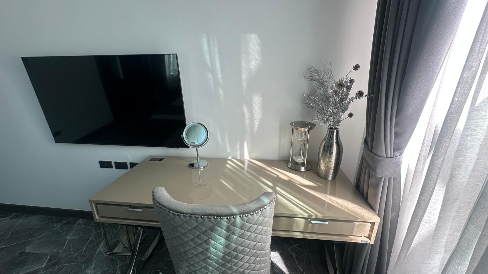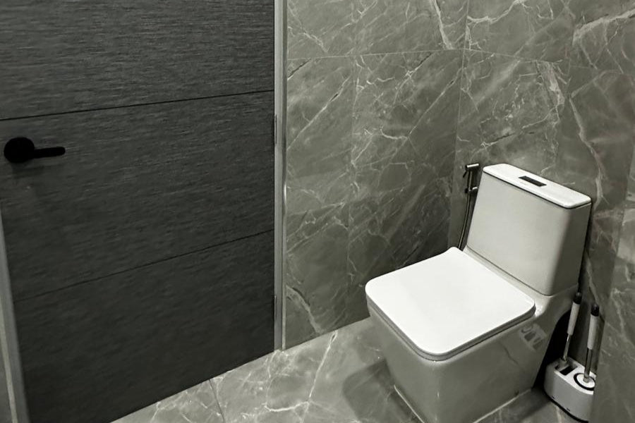 The property features a home theater system with cable TV and Wi-Fi, CCTV, and private parking. Designed with 4.5-meter-high ceilings, all rooms are bright and well-ventilated, with warm wooden finishes that add a natural charm. Outside, there's an 8-meter marble swimming pool with jacuzzi jets and a waterfall, plus a BBQ area. Additional highlights include a 75-inch TV, dishwasher, water filter, smart door lock, and freehold ownership with no common fees.
