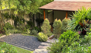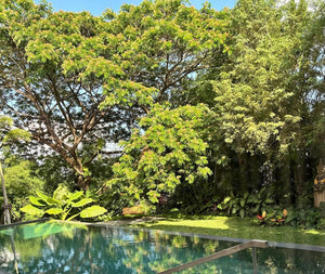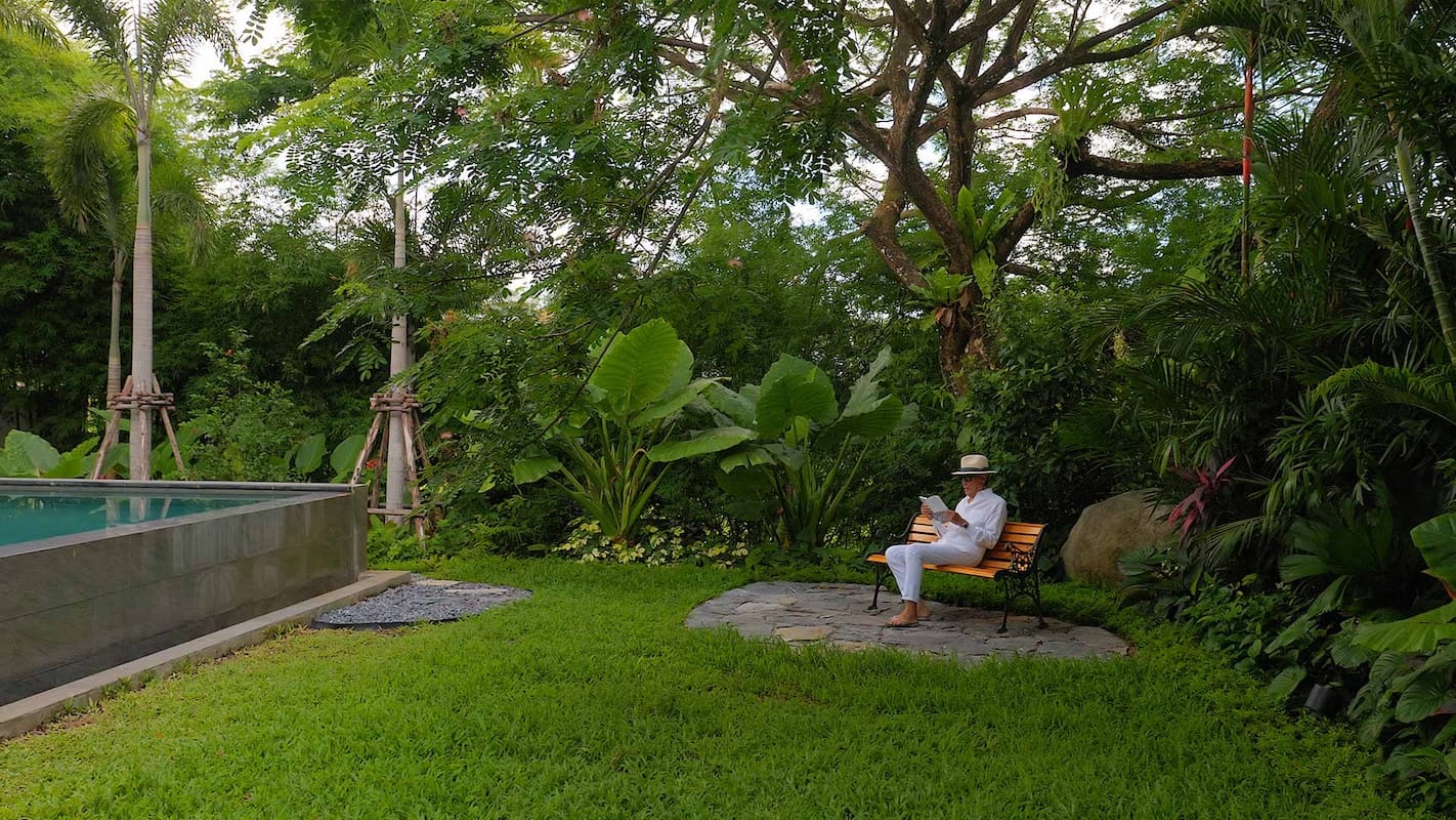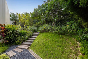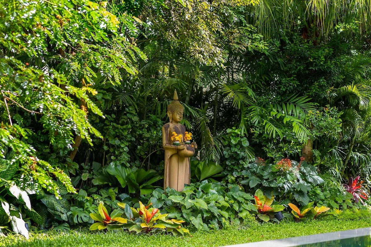 Outside, a 13-metre saltwater infinity pool anchors the sun-soaked terrace. Is ideal for lounging, dining, or entertaining beneath the tropical sky. Mature trees including towering palms, a 20-metre Rain Tree, and rare Siamese Rosewood, encircle the garden, providing both shade and serenity. A seated stone Buddha sculpture presides over this tranquil space, while flagstone paths wind through manicured lawns, flowering plant beds, and a discreet potting shed. The driveway accommodates four vehicles, with an enclosed garage providing secure covered parking.