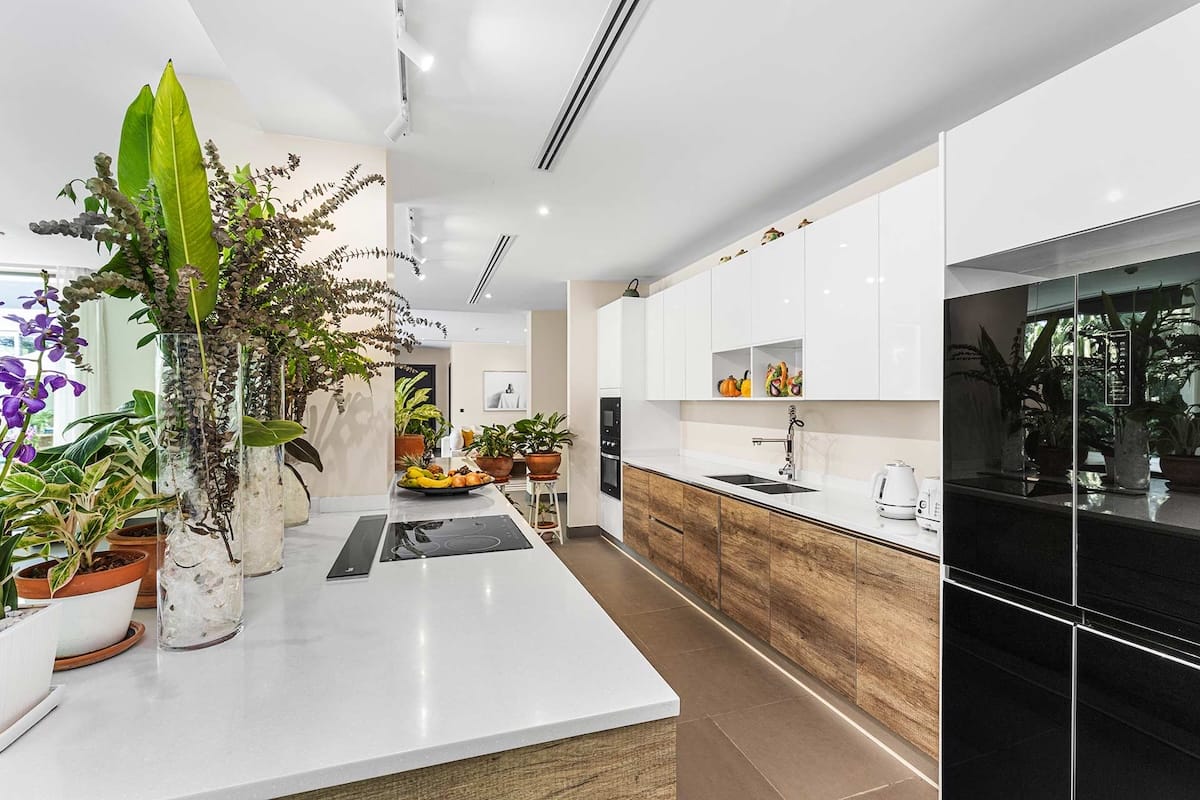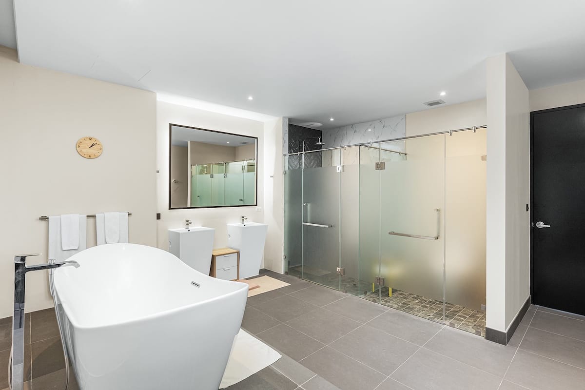 On the ground floor, expansive open-plan living areas flow seamlessly from the designer kitchen and central island to the formal dining area and 42-square-metre entertainment lounge. Large sliding glass doors open directly onto the pool terrace, allowing for effortless indoor-outdoor living. Two guest bedrooms one spacious and one more intimate offer private bathrooms and direct garden access. A separate Thai kitchen, pantry, and maid’s living area further support the home’s practicality for full-time residence or hosting.