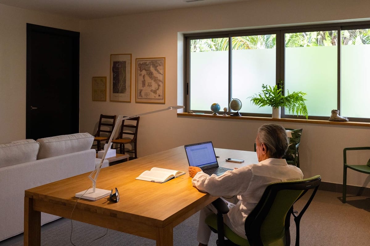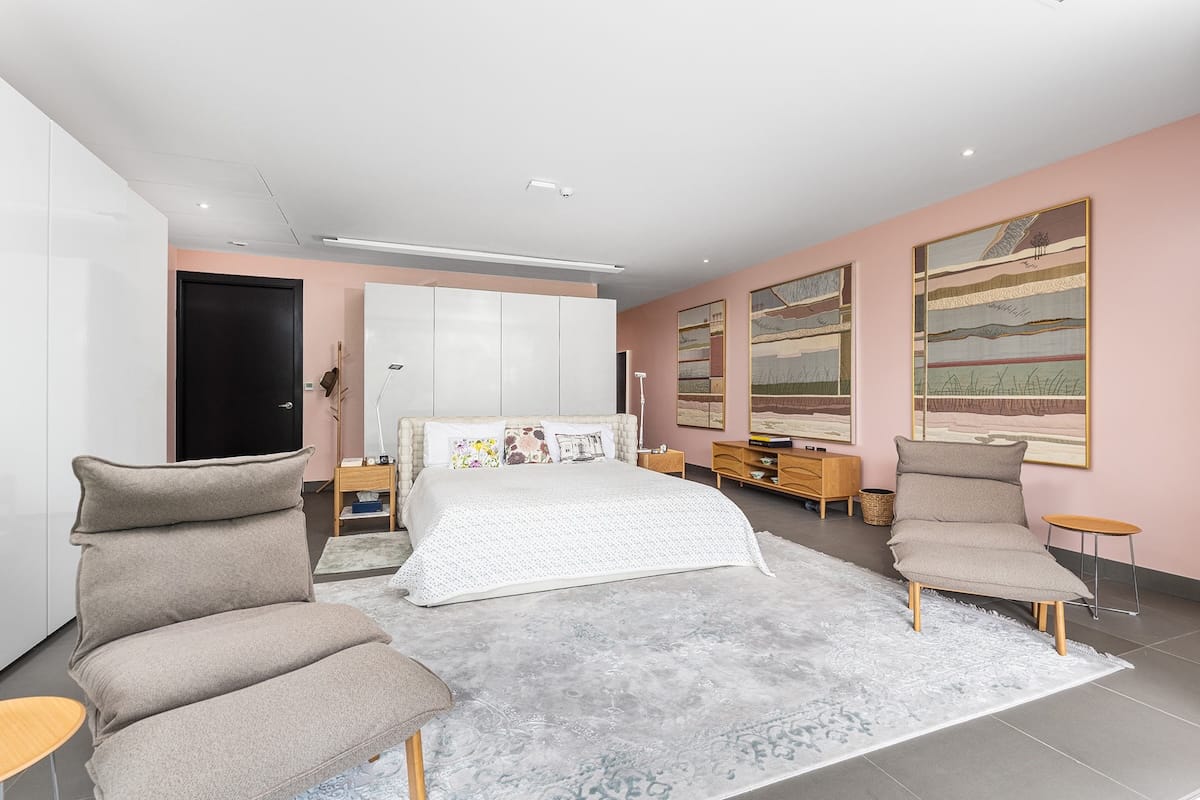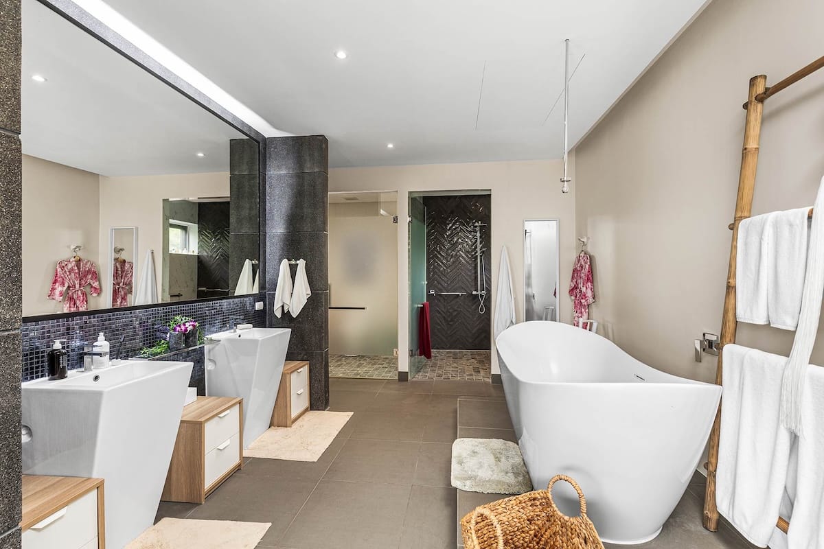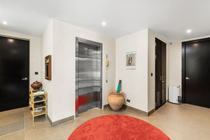 The villa’s entrance leads through a welcoming foyer to a thoughtfully designed upper level. Here, the master suite and a versatile studio-bedroom open onto private verandas with tranquil garden and mountain views. The master bathroom features a deep soaking tub, rain shower, and dual vanities, while the adjacent studio includes generous workspace, floor outlets, and a large walk-in wardrobe. A third room on this level currently serves as a library and media lounge but can be adapted to suit personal needs. The upper floor is accessible via both the main staircase and a newly installed Schindler lift designed for full wheelchair accessibility from the garage level.