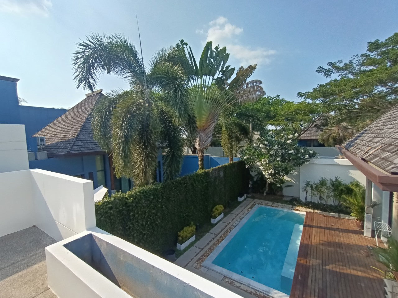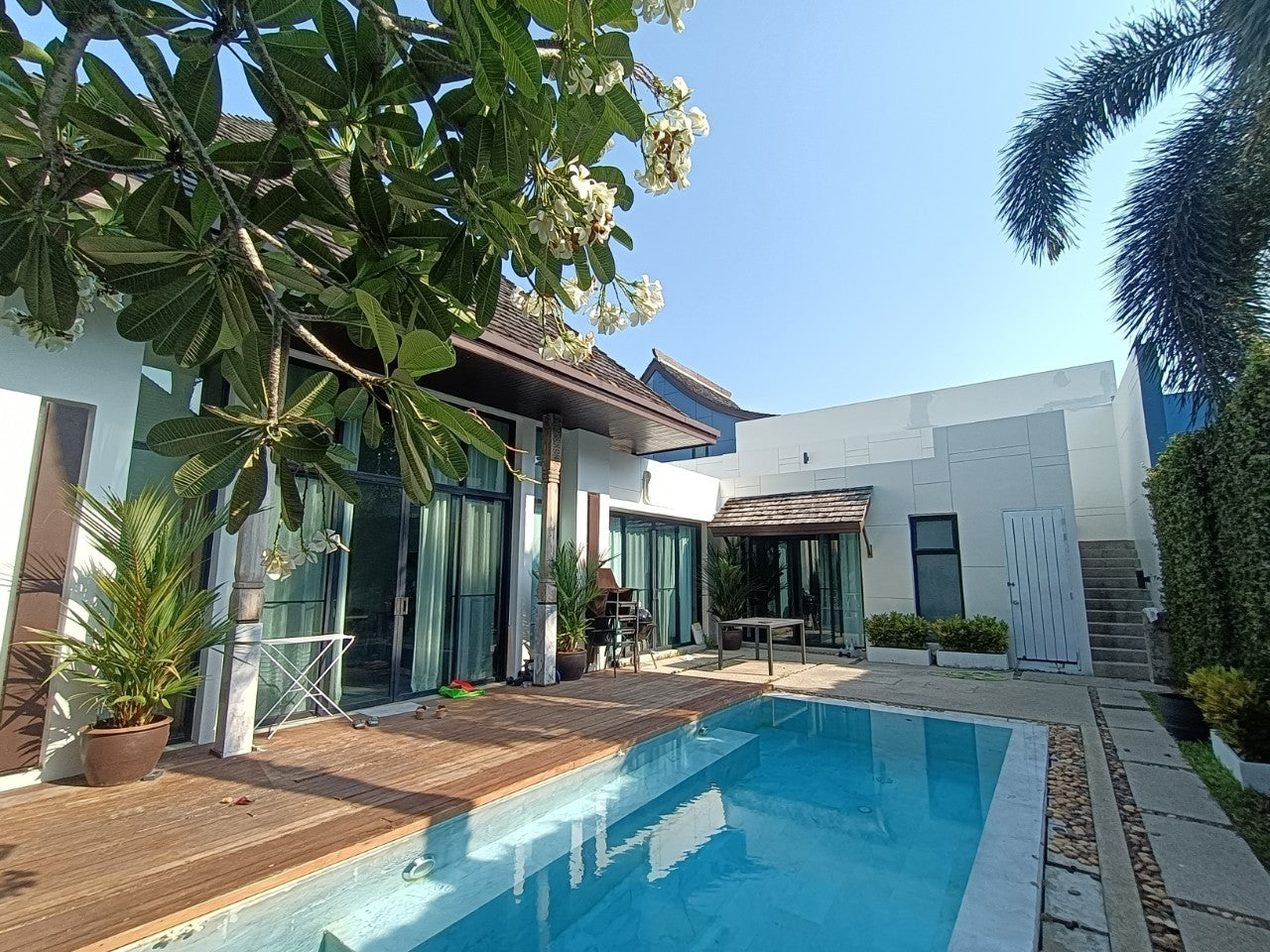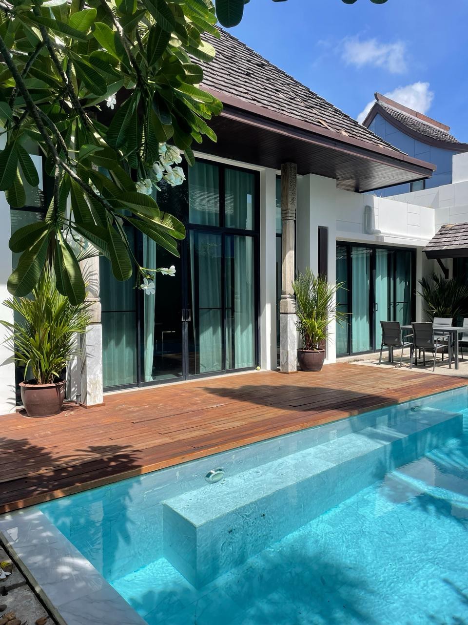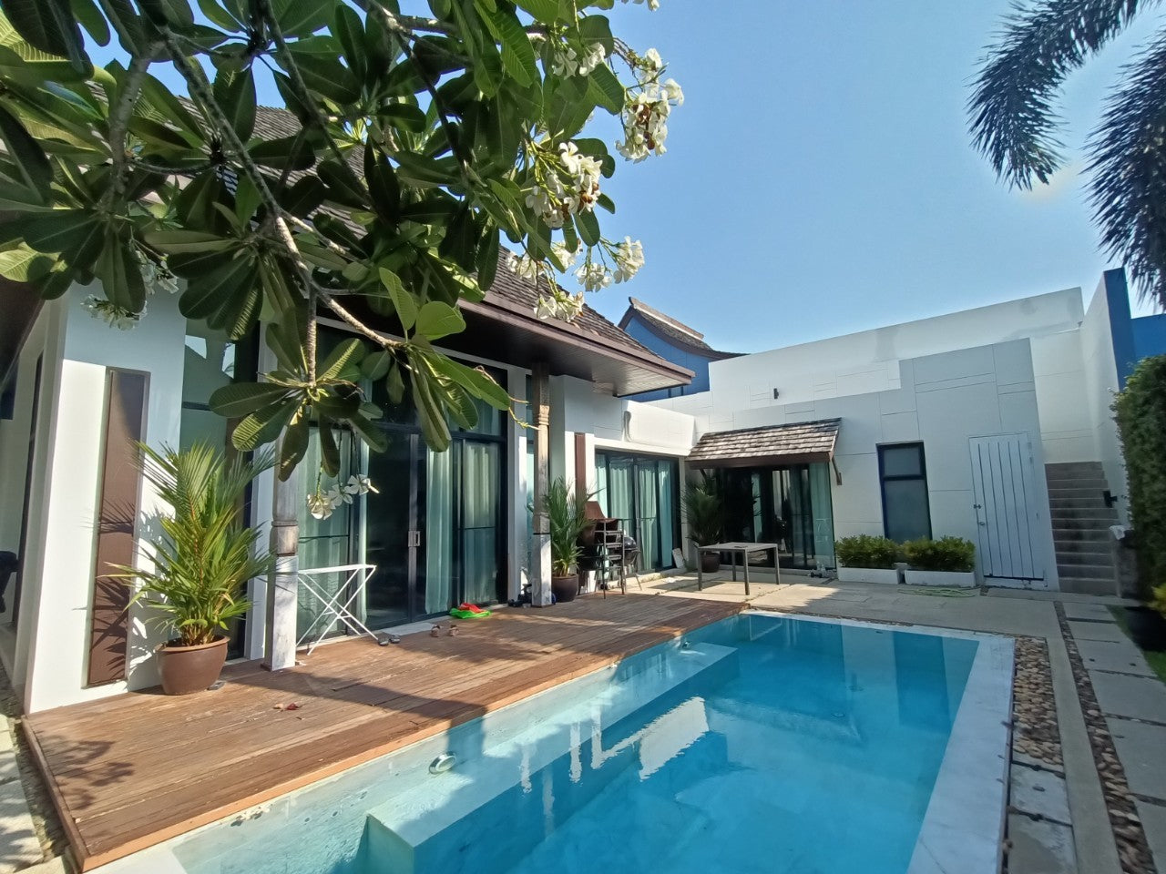 This Two bedrooms villa designed in the romantic Sino architectural concepts L shape layout around the swimming pool with a plot size 215.20 sq.m. An open living/ dining/built-in kitchen bathroom with bathtub and separated shower area, storage room and second floor terrace.