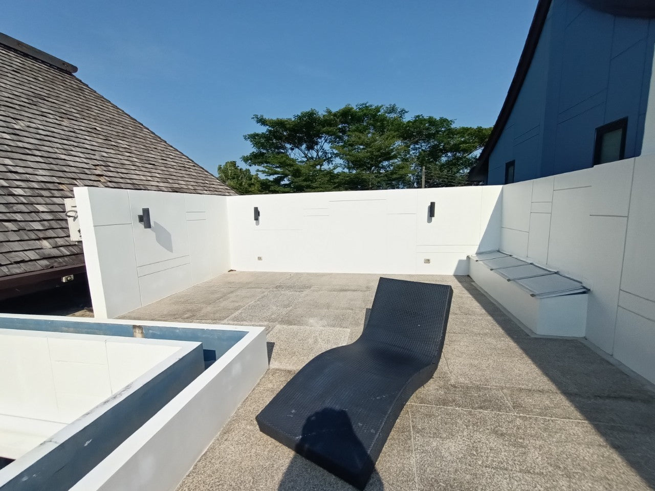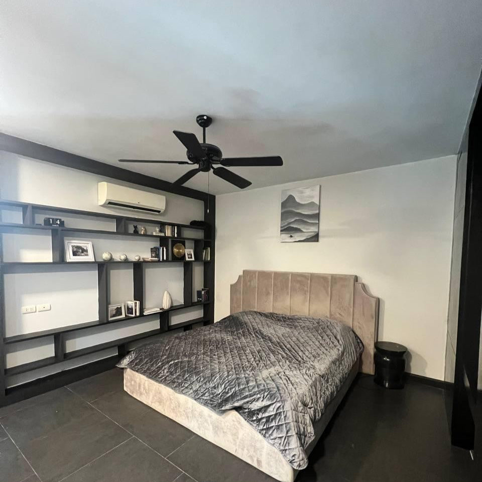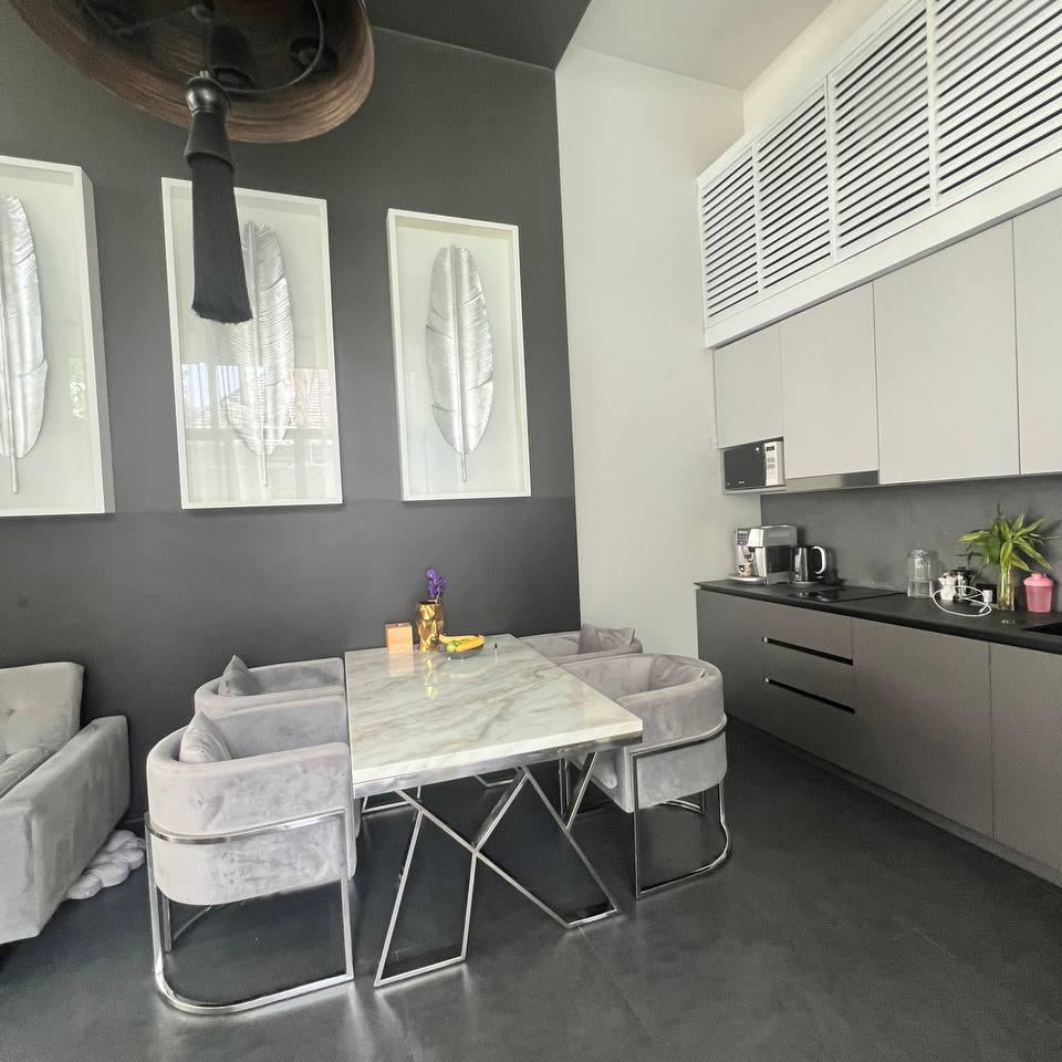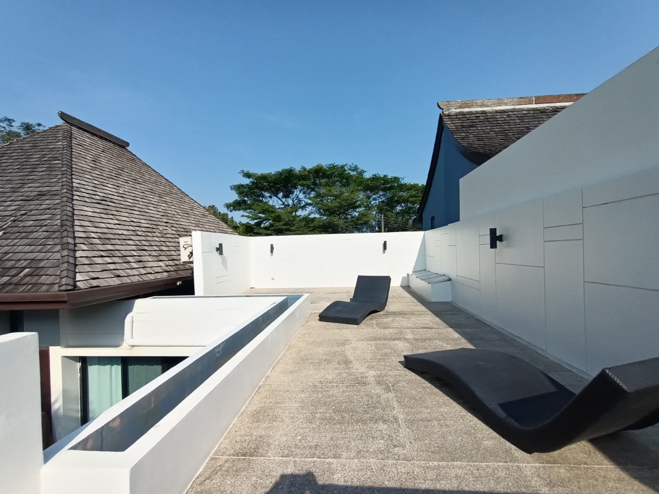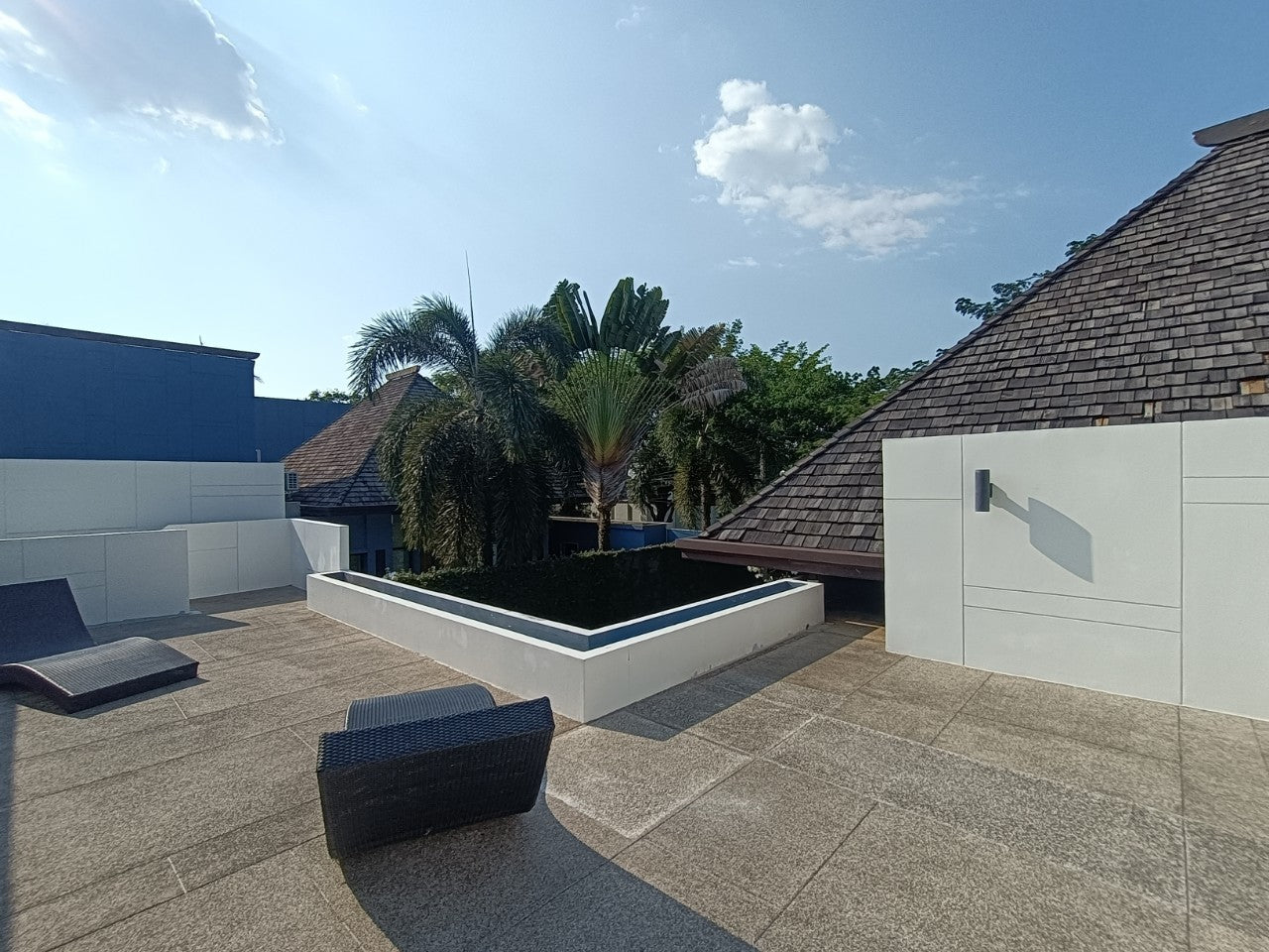 This Two bedrooms villa designed in the romantic Sino architectural concepts L shape layout around the swimming pool with a plot size 215.20 sq.m. An open living/ dining/built-in kitchen bathroom with bathtub and separated shower area, storage room and second floor terrace.