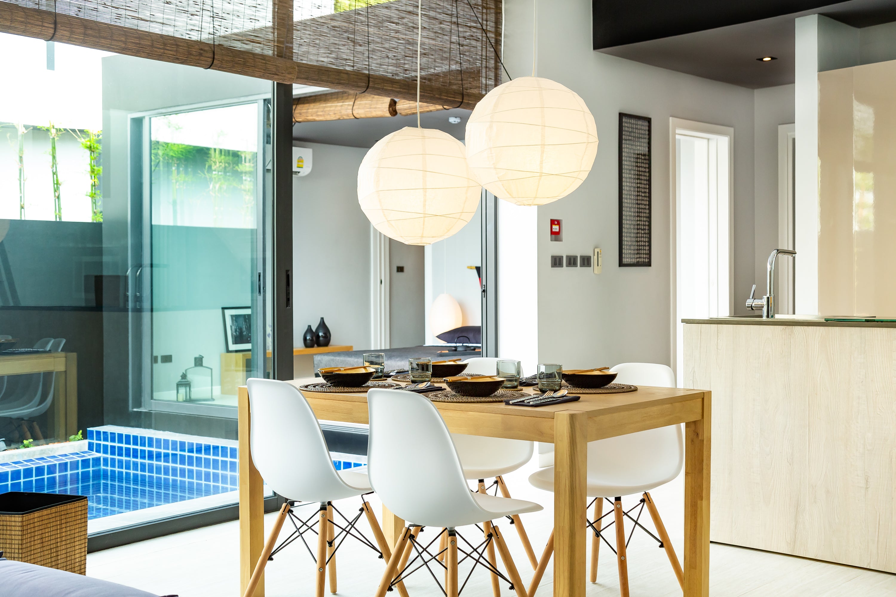 Functionality meets design throughout. The kitchen is equipped with top appliances and generous workspace, while the villa includes high-speed internet and smart TVs for both work and entertainment. Despite its clean, minimalist aesthetic, the home feels warm and welcoming, ideal for longer stays or remote working in a tranquil environment.